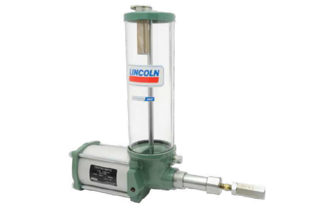 Pump model 82570 is a high-volume pump with an air-powered forward stroke discharging lubricant. The acrylic reservoir is replenished using the strainer filling cap and has a check/relief valve to relieve pressure on the lubrication line.